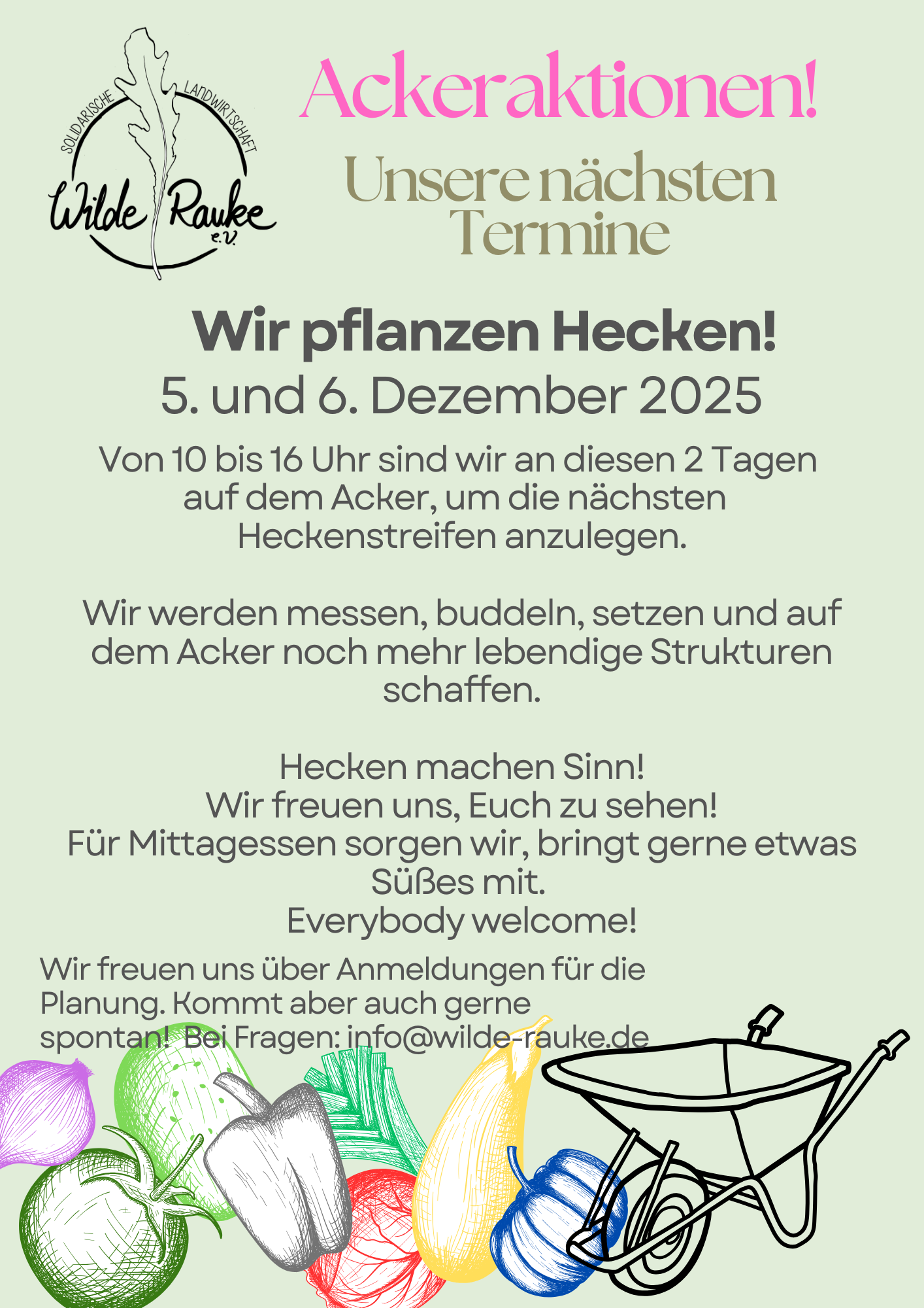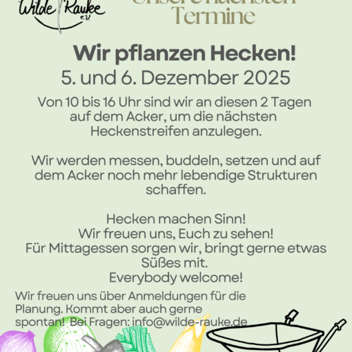 Schon als wir die ersten Ideen zu unserem Acker hatten, war klar, dass wir unseren Gemüseacker mit einer Hecke umpflanzen wollen. Als wir in 2024 das erste Mal auf den Acker konnten, haben wir neben den beiden Folientunneln auch unsere erste 70m lange Naturschutzhecke gepflanzt. Aktuell ist sie natürlich noch klein und braucht viel Pflege, um nicht im aufwachsenden Gras zu verschwinden oder mit der langen Trockenheit einzugehen. Doch bald wird sie eine imposante Hecke, die aus verschiedenen Gehölzen wie Stieleiche, Vogelkirsche, Holunder, […]